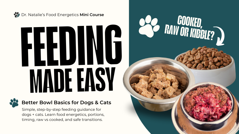 Simple, step-by-step feeding guidance for dogs + cats. Learn food energetics, portions, timing, raw vs cooked, and safe transitions.